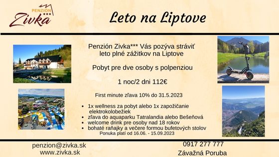 Leto plné zážitkov na Liptove s Vašou rodinou a priateľmi..Čaká na Vás turistika, 1125 km značených turistických trás siahajúcich až do výšky 2500 m. Spoznávajte okolie na bicykli alebo si požičajte naše elektrokolobežky. Liptov je známi prechádzkami vhodnými pre rodiny s deťmi, výstupmi na vrcholy, ale aj náročnými hrebeňovými túrami.