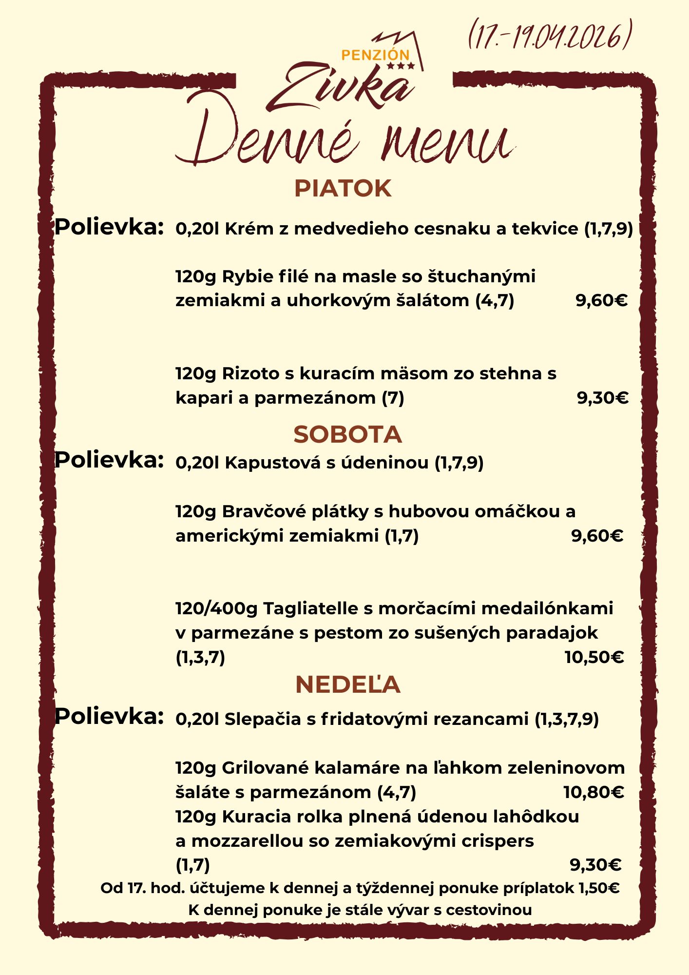Pozývame Vás počas celého týždňa aj cez víkend vychutnať si našu týždennú aj dennú ponuku výborného jedla.